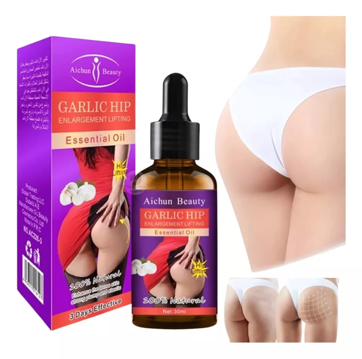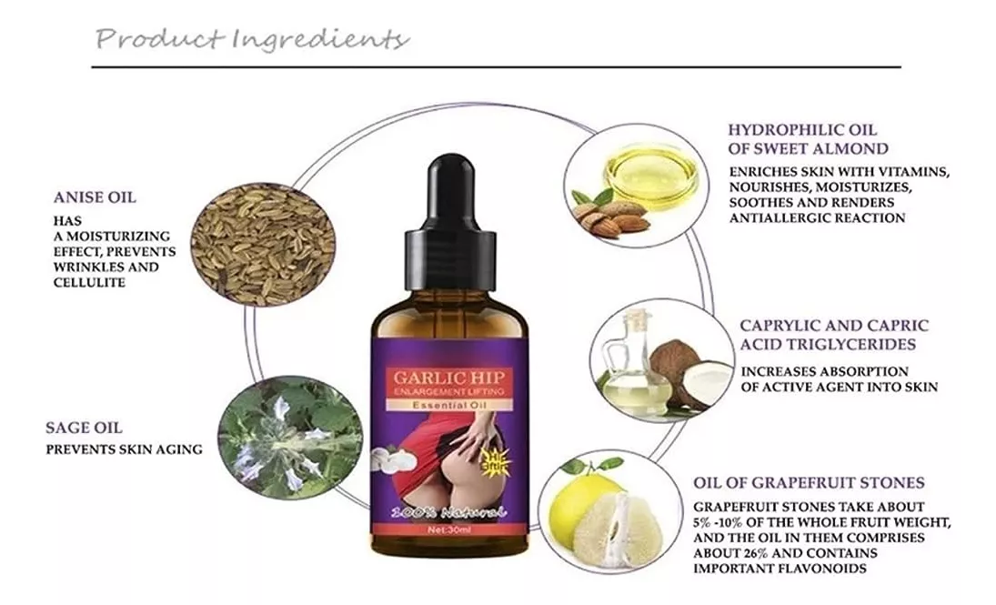 Modo de uso: ? Coloca una toalla caliente sobre la zona 1-2 minutos antes de aplicar. ? Aplica el aceite en los glúteos y masajea con movimientos firmes de abajo hacia arriba. ? Repite el masaje 10 veces para potenciar sus efectos.